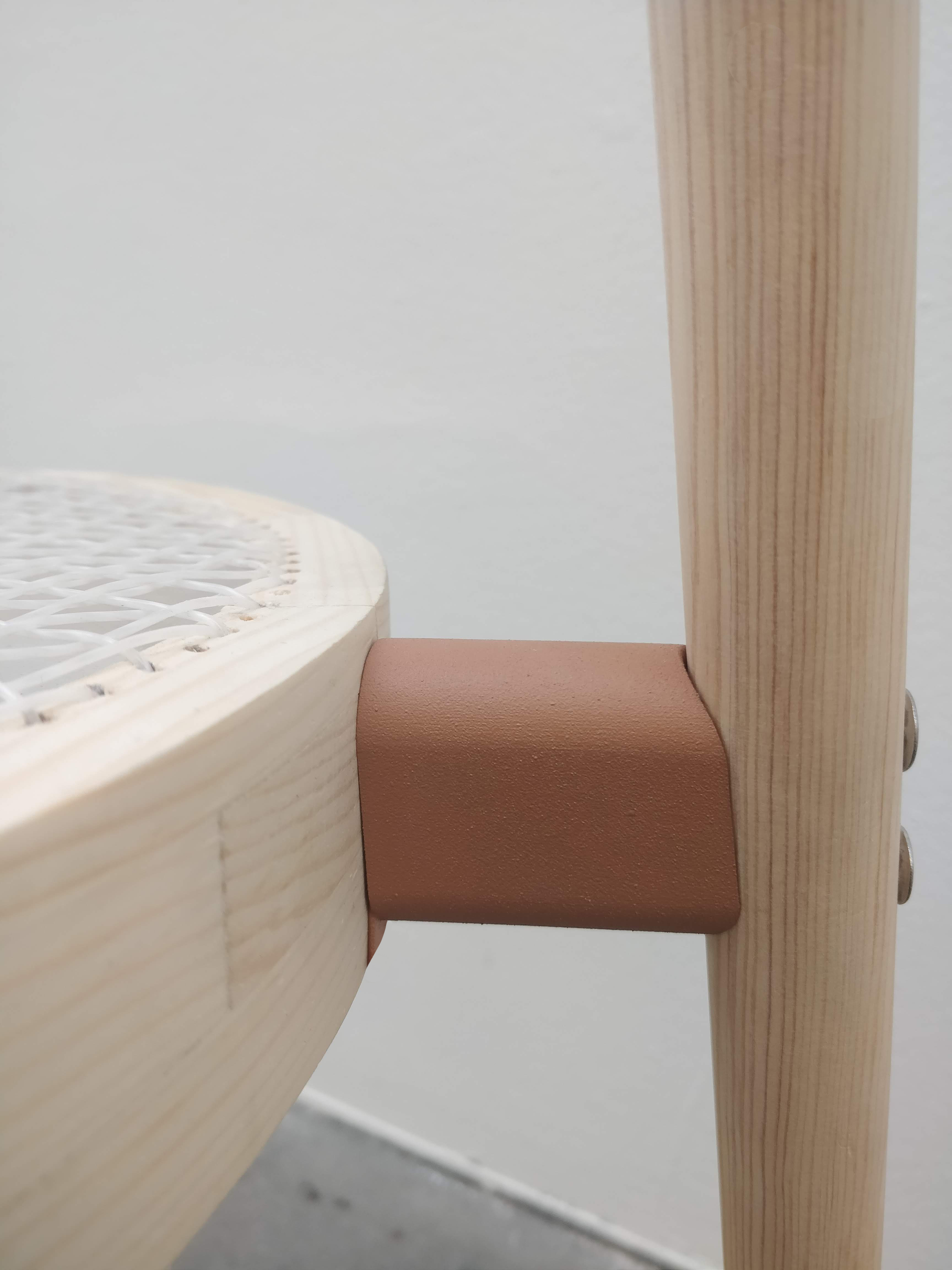 The seat is designed for being combined with diverse colors and materials, like rattan, leather, tennis wire and solid wood for this.