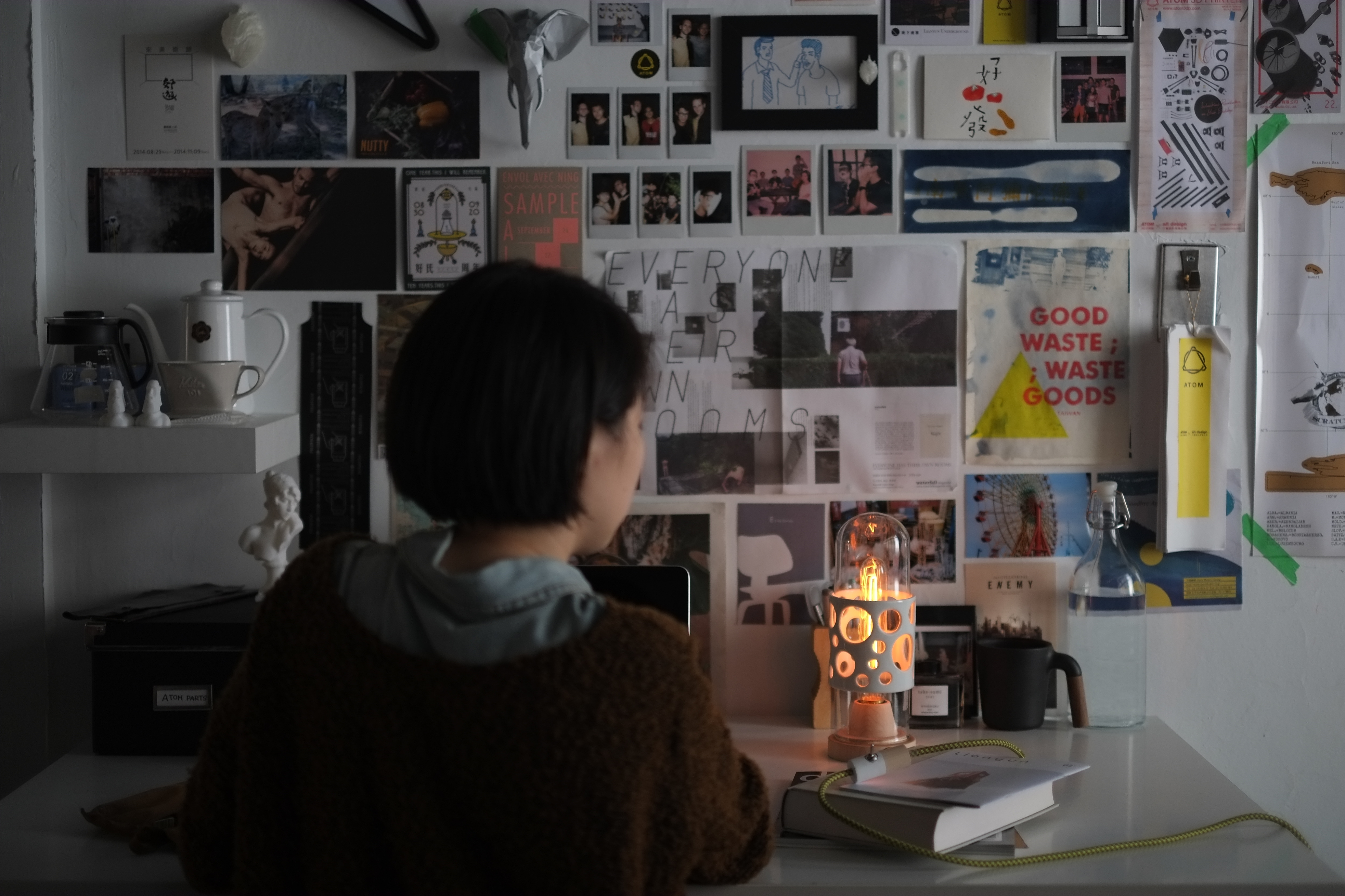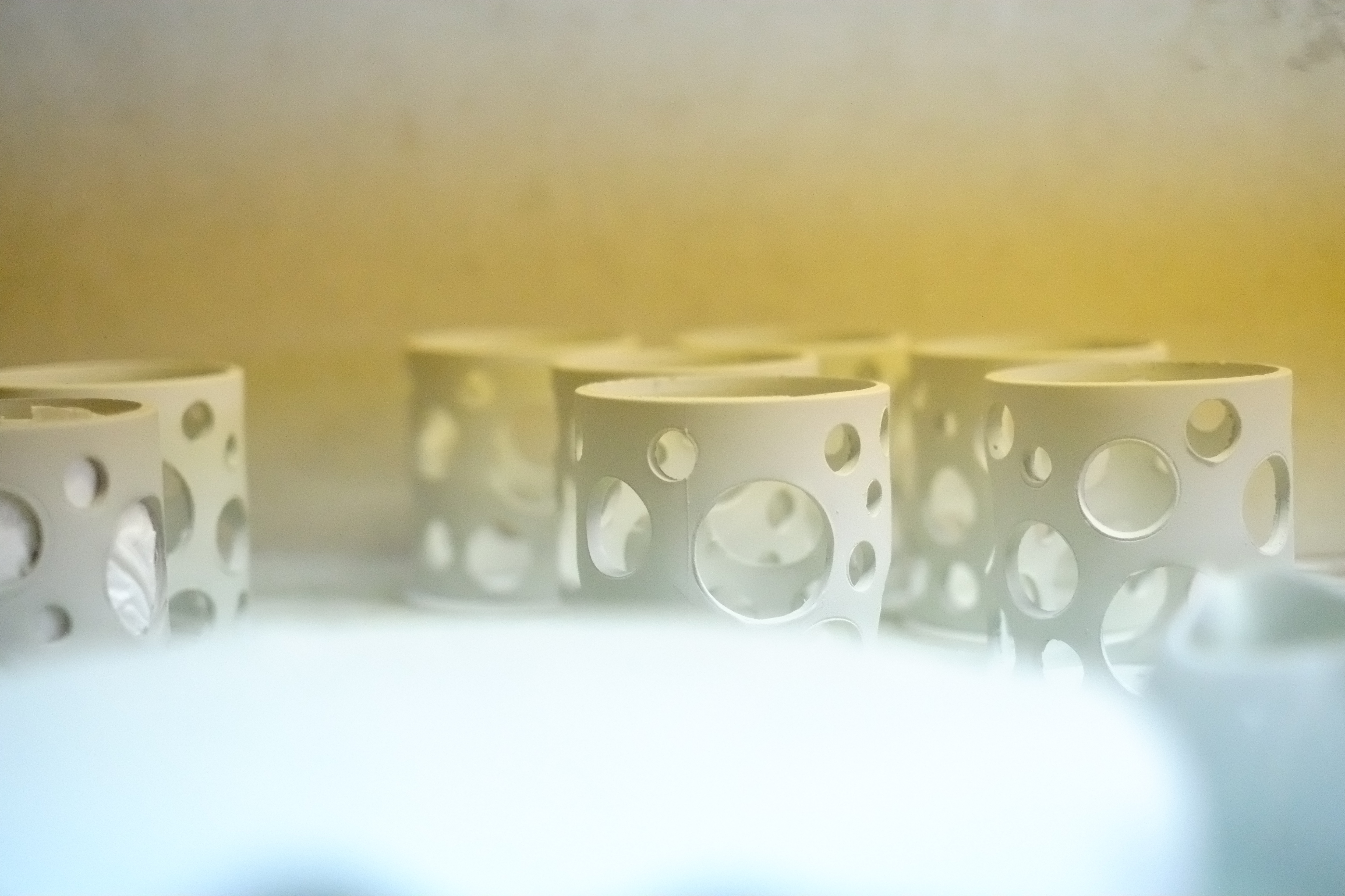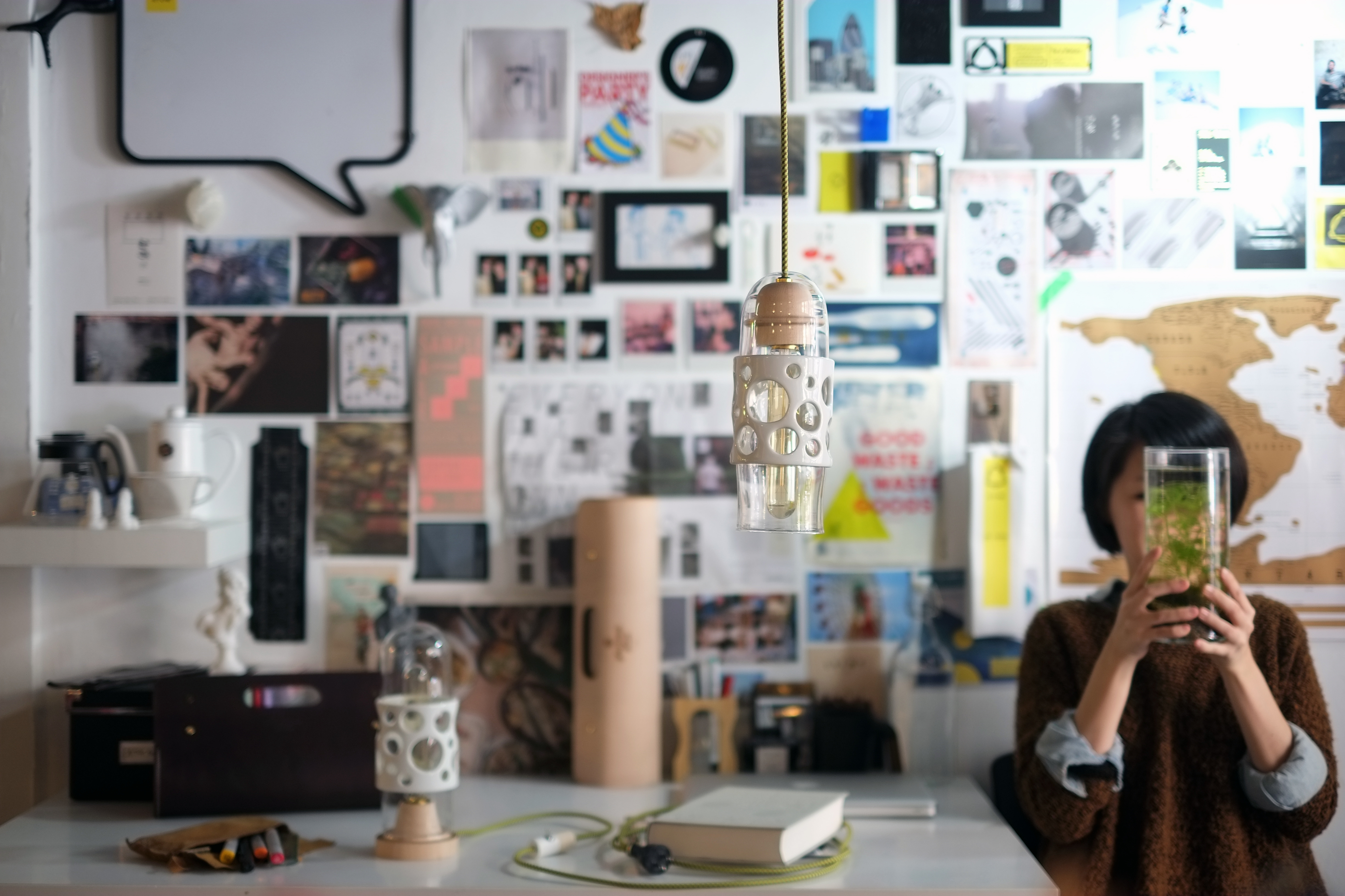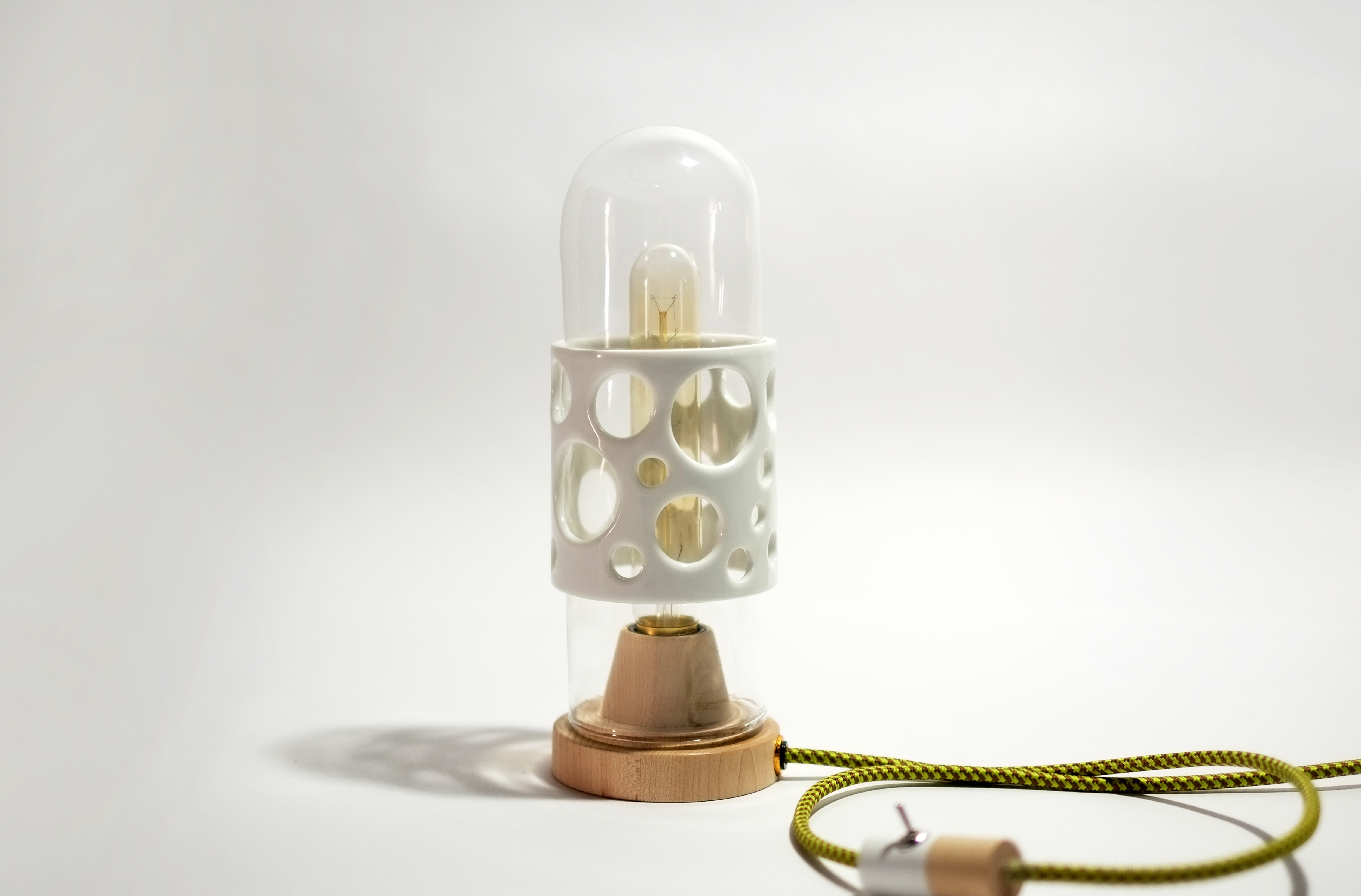 而光本身就是最好反映出「穿透」的題材,也是使脆弱的東西明顯感受出力量的樣子,因而我們把它發展設計於燈具上,陶瓷上的圓洞造型使得玻璃透出,如同泡泡 的樣子,光照著或許置身泡泡隨時會消失的錯覺中,但是我們反向思考,他們的結合,好像是一種泡泡瞬間停格的永恆概念,我們彷彿能抓住那個破掉前的瞬間那刻 然後就此停住,光依舊亮著,製造了抓住永恆的一角。