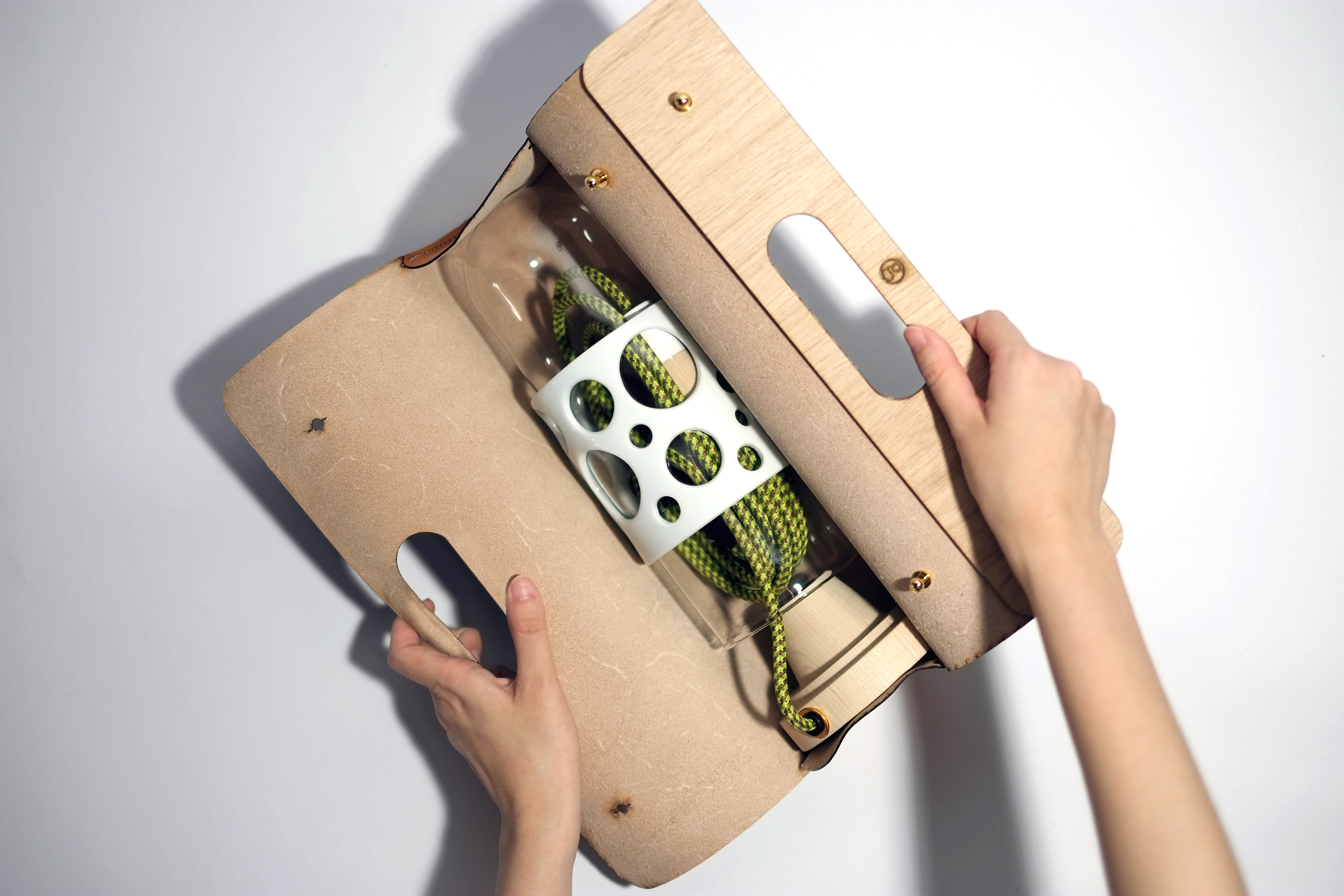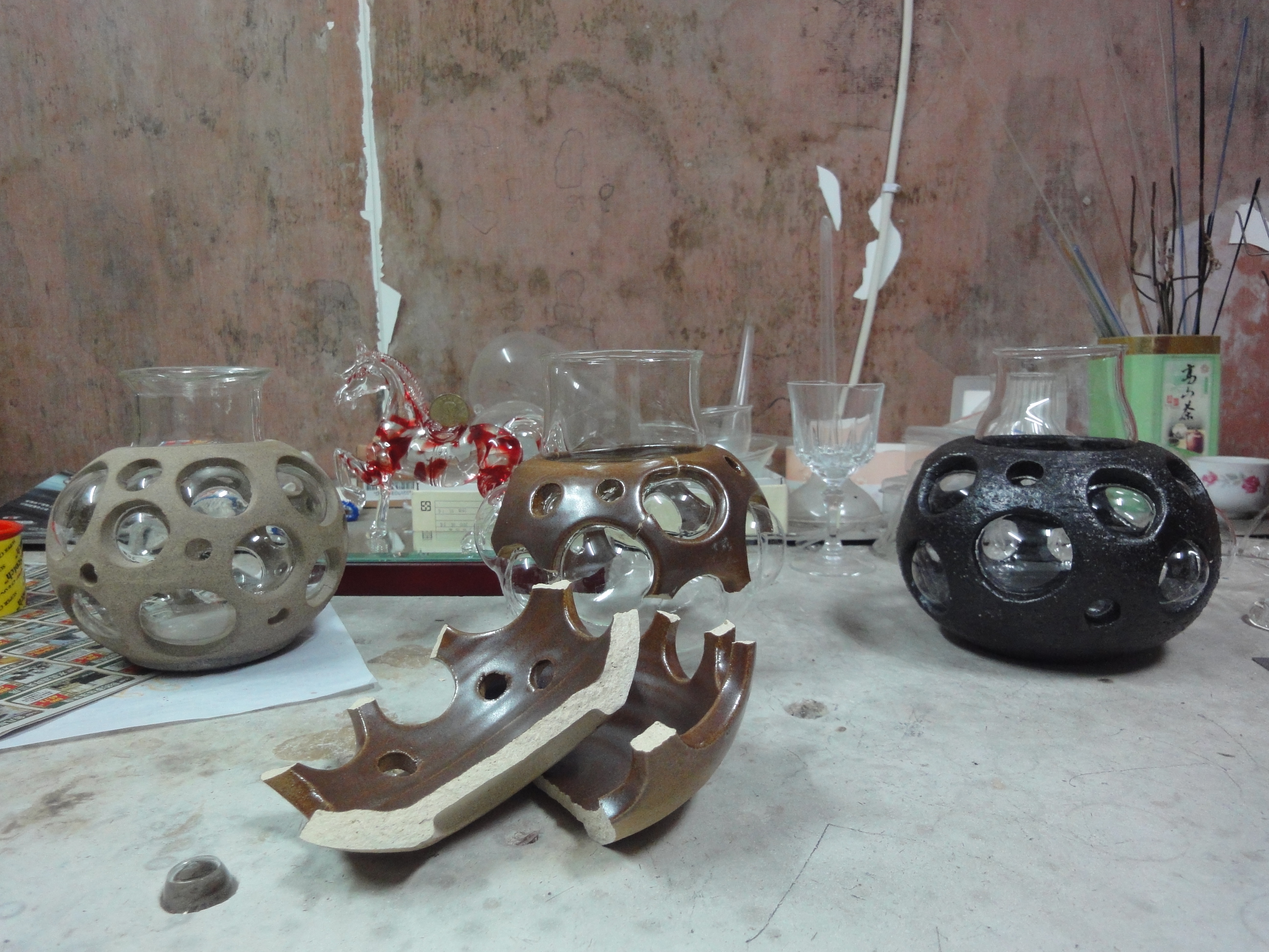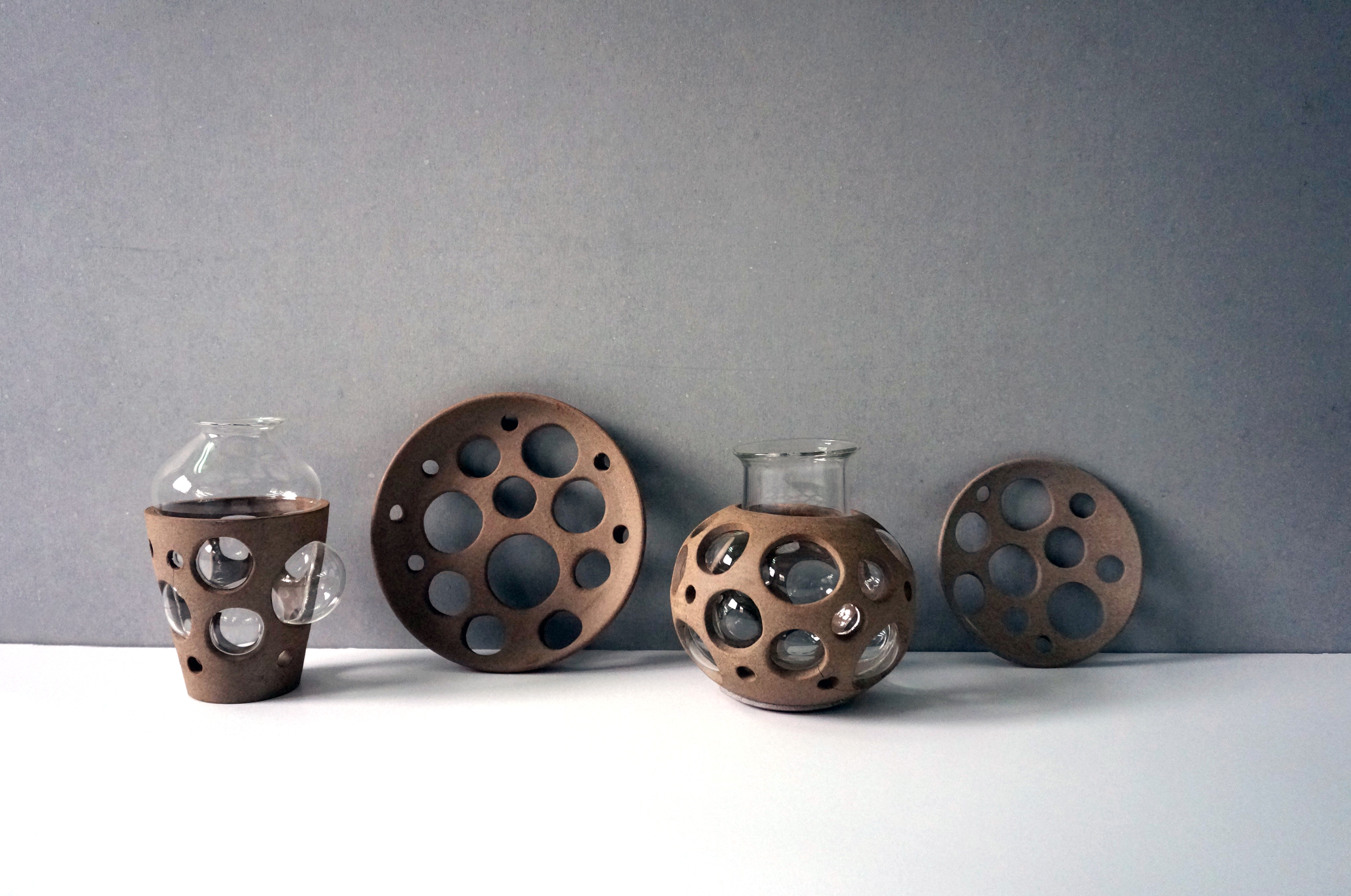 易碎的。陶瓷和玻璃正是屬於這樣性質的東西,都是必須使用高度的技術才能塑形,兩者的製造過程中很巧妙地恰好相反,玻璃高溫、軟化、塑形、冷卻定型;而陶 瓷塑形、高溫、然後定型,在這樣易碎的性質下卻都各自經歷了高溫的焠鍊磨成的材質,我們想讓兩者結合,但是陶瓷和玻璃的結合往往需要高度精密的方法或是使 用不易牢靠的黏著劑等等,我們套用了工業設計模具的概念,利用反脫模的方式,反向思考使陶瓷本身成為模具,吹製的玻璃如同射出成型的泡泡,搭配上陶瓷上的 洞因而形成了反拔薄的形態,這樣的有趣過程巧妙地把它們結合在一起。